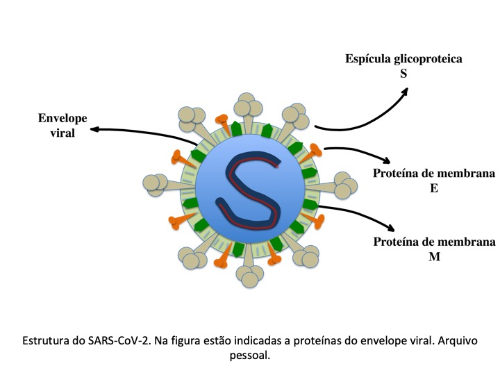 A imagem a seguir, Figura 7, é a representação esquemática da partícula do SARS-CoV-2, indica as proteínas presentes no envelope viral. Trata-se de um virus envelopado. Diferente dos rinovírus.